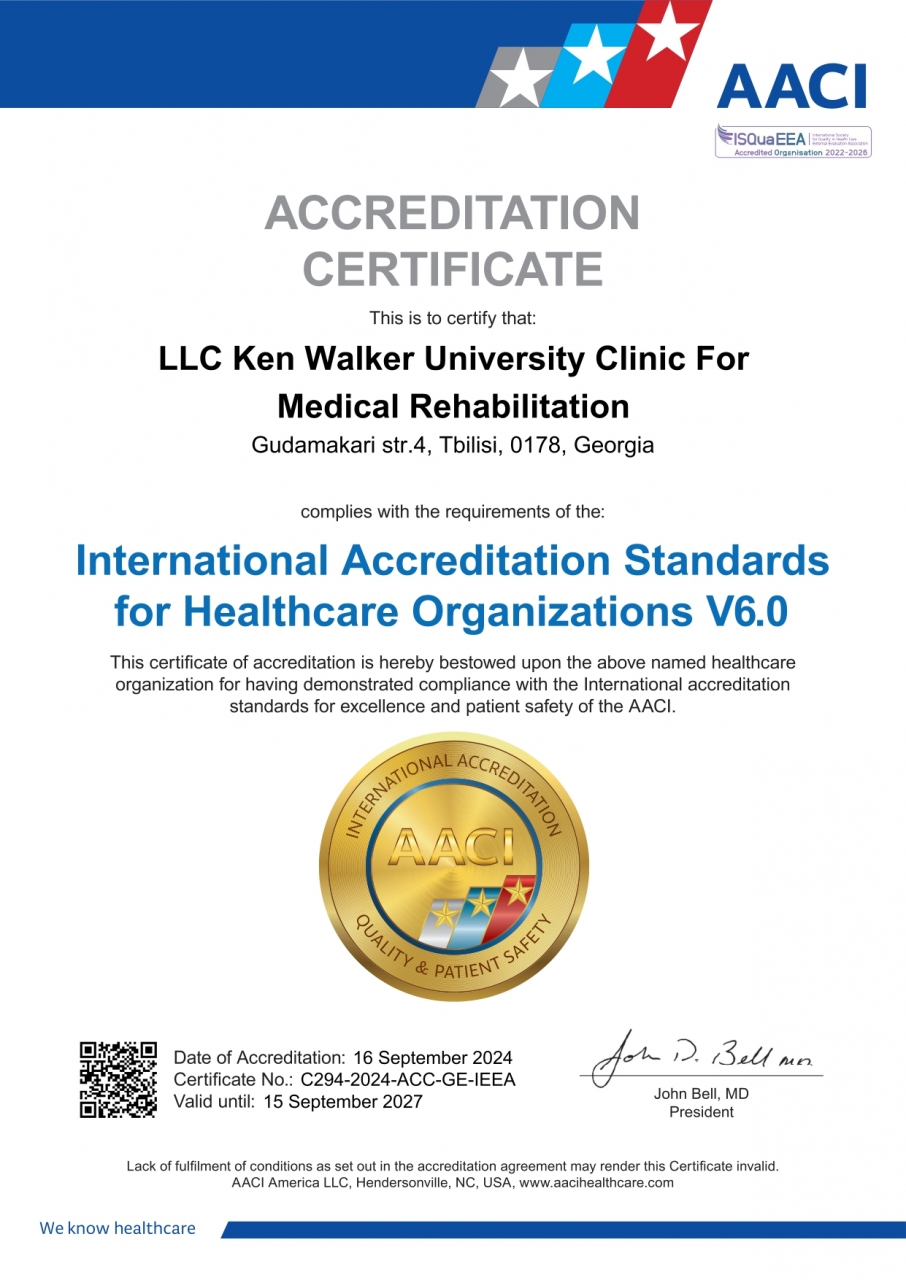 კენ ვოლკერის კლინიკამ საერთაშორისო აკრედიტაცია მოიპოვა. ამერიკის აკრედიტაციის კომისიის გადაწყვეტილებით კენ ვოლკერის კლინიკას მიენიჭა საერთაშორისო აკრედიტაცია ჯანდაცვის ორგანიზაციებისთვის და ISO 9001:2015 მენეჯმენტის სისტემის სტანდარტი. საერთაშორისო აკრედიტაცია არის გარანტია, რომ თქვენ მიიღებთ უმაღლესი ხარისხის მომსახურებას. ჩვენი პრიორიტეტია თქვენი ჯანმრთელობა და კეთილდღეობა - სწორედ ამიტომ გთავაზობთ თანამედროვე სტანდარტების შესაბამის მკურნალობას, რომელიც მორგებულია თქვენს ინდივიდუალურ საჭიროებებზე. განსაკუთრებული მადლობა ჩვენი კლინიკის გუნდს ამ მიღწევისთვის!