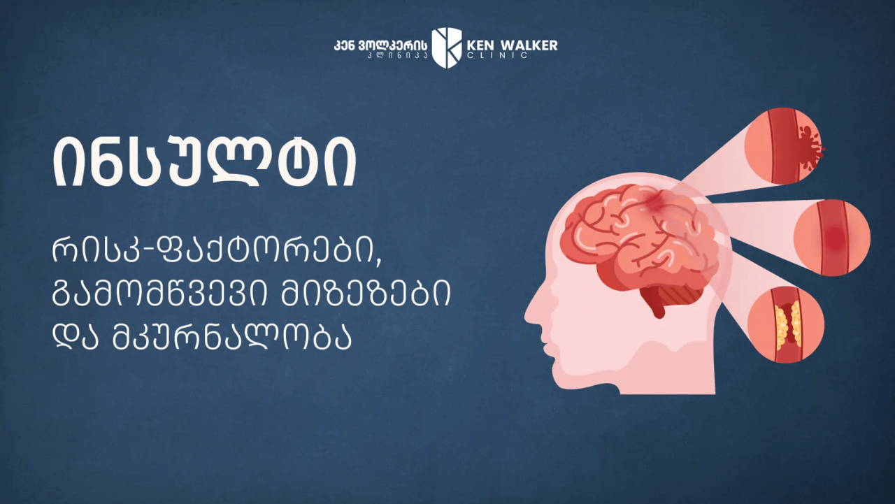 რა არის ინსულტი? ინსულტი მძიმე ნევროლოგიური მდგომარეობაა, რომელიც გამოწვეულია თავის ტვინში სისხლის მიმოქცევის უეცარი მწვავე დარღვევით. ლათინური სიტყვა "insultus" ნიშნავს "დარტყმას" ან "შეტევას". დაავადების გამომწვევი მიზეზი შეიძლება იყოს თავის ტვინის სისხლძარღვების ბლოკირება, რის შედეგადაც ტვინის ქსოვილს არ მიეწოდება ჟანგბადი და აუცილებელი საკვები ნივთიერებები. სისხლის ნაკადის შეჩერებამ თუნდაც რამდენიმე წამით შეიძლება გამოიწვიოს ტვინის უჯრედების დაზიანება. დაზიანების ხარისხი დამოკიდებულია სისხლის ნაკადის დარღვევის არეალზე. შესაძლებელია მოხდეს ტვინის ფუნქციის მსუბუქი დარღვევა, ან დიდმა ტერიტორიულმა დაზიანებამ შესაძლოა გამოიწვიოს ღრმა შეუქცევადი შედეგები. ინსულტის ორი ძირითადი ტიპი არსებობს: იშემიური ინსულტი – გამოწვეულია თავის ტვინის მკვებავი სისხლძარღვის დახშობით, რაც შესაძლოა თრომბმა გამოიწვიოს. ჰემორაგიული ინსულტი – გამოწვეულია თავის ტვინში სისხლჩაქცევით, როდესაც დაზიანებული სისხლძარღვის კედელი სკდება და იწყება ტვინში სისხლდენა. ეს შესაძლოა განვითარდეს მაღალი არტერიული წნევის, ანევრიზის გასკდომის ან სხვა კოაგულაციური დარღვევების შედეგად. სტატისტიკურად, უფრო გავრცელებულია ინსულტის იშემიური ფორმა, ვიდრე ჰემორაგიული. ინსულტის განვითარების რისკ-ფაქტორები ინსულტის რისკ-ფაქტორებია: მაღალი არტერიული წნევა (ჰიპერტენზია) გულის დაავადებები შაქრიანი დიაბეტი ჭარბი წონა, კვებითი დარღვევები თამბაქოს და ალკოჰოლის ჭარბი მოხმარება მაღალი ქოლესტერინი გენეტიკური წინასწარგანწყობა ფიზიკური აქტივობის ნაკლებობა კონტრაცეპტივების გამოყენება ქალბატონებში ძილის აპნოე, ანუ ხვრინვის დროს ძილში სუნთქვის გაჩერება ძლიერი სტრესი ინსულტის ძირითადი სიმპტომები ინსულტის ამოცნობა სწრაფი რეაგირებისათვის კრიტიკულად მნიშვნელოვანია. ყველაზე გავრცელებული ნიშნებია: სახის ასიმეტრია (მაგ., პირის კუთხის ჩამოშვება) ერთი ან რამდენიმე კიდურის ფუნქციის შეზღუდვა, სისუსტე ან მოძრაობის უნარის სრული მოშლა მეტყველების დარღვევა ან სირთულე სიტყვების წარმოთქმაში უეცარი დაბინდული ხედვა ან მხედველობის დაკარგვა ერთ ან ორივე თვალში უეცარი ძლიერი თავის ტკივილი უცნობი მიზეზით თავბრუსხვევა, გულისრევა, გონების დაკარგვა F.A.S.T. მეთოდი ინსულტის ადრეული ამოცნობისთვის გამოიყენება F.A.S.T. მეთოდი: Face (სახე): მოსთხოვეთ ადამიანს გაღიმება და შეამოწმეთ სახის ასიმეტრია. Arms (მკლავები): მოსთხოვეთ ორივე მკლავის აწევა. შესაძლოა ერთი მკლავი ვერ აწიოს. Speech (მეტყველ